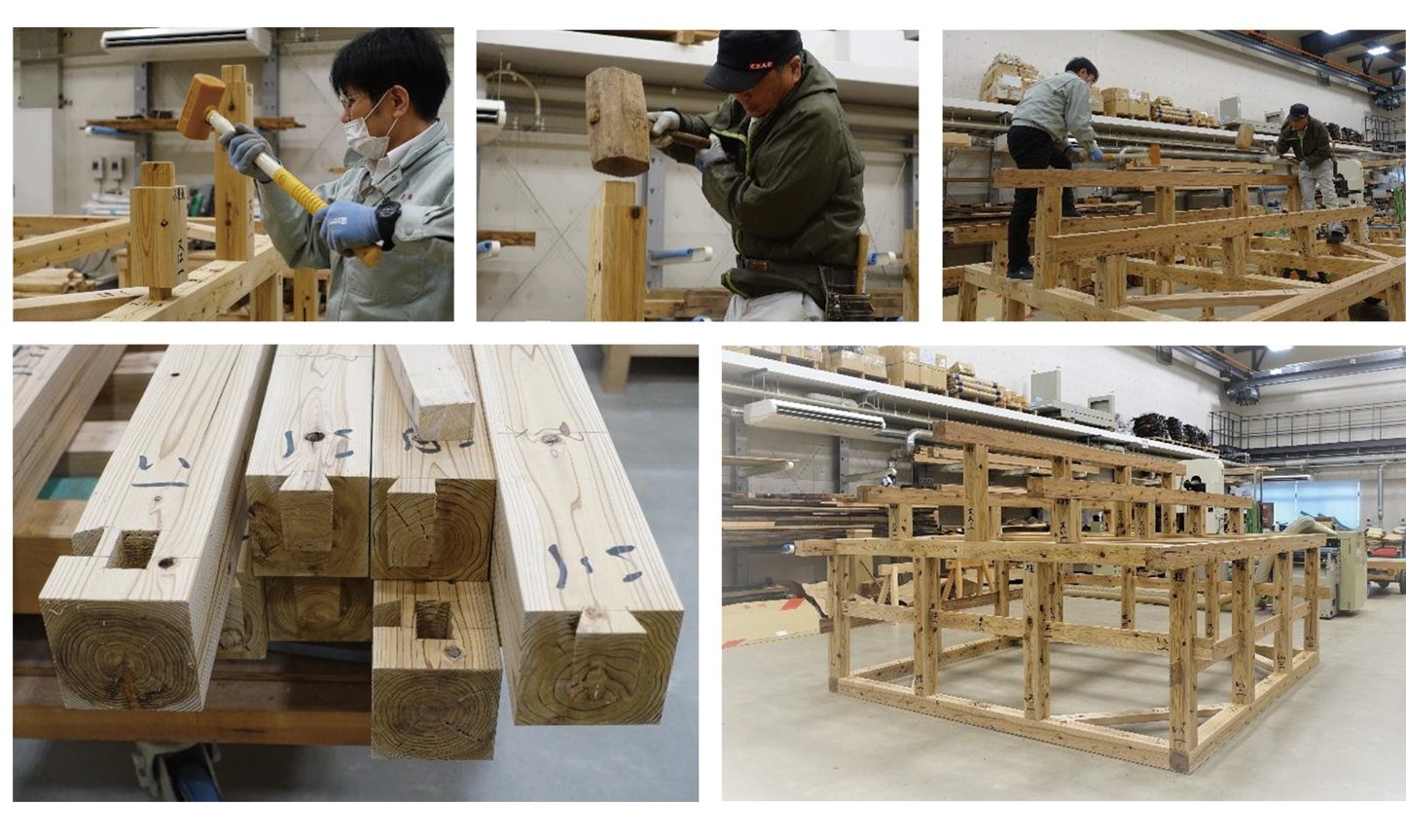 文化財修復・展示棟内の歴史的建造物修復工房では、奈良県文化財保存事務所が文化財建造物の修理を行っています。普段は入ることのできない工房の中に入り、修理に使用する伝統的な道具などを体験するワークショップも行っています。今回は、イベント用に施行しやすい大きさで調整した模型を用い、土台の組立から柱の据え付け、柱貫、小屋組の組み立てを、掛矢(かけや)等の大工道具を用いて、実際に建物が組み上がる過程や解体方法等の体験を行います。